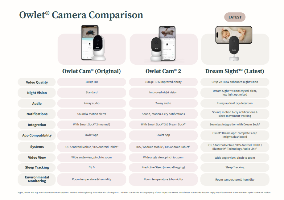 There are three versions of the Owlet Camera - now the version 1 and version 2 are no longer being sold, they have been replaced with the Dream Sight. See below the difference between each version: